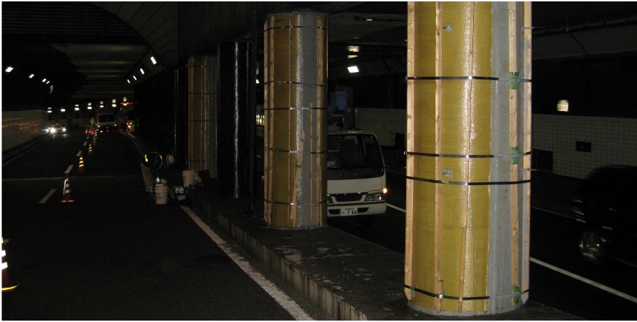 鉄筋コンクリート橋脚の補強には高強度・軽量のアラミド繊維シート巻き立て工法が有効である。通常、樹脂を塗り重ね、アラミド繊維シートに樹脂を含浸して硬化させる工程があり、本工事においては作業時間が問題となった。