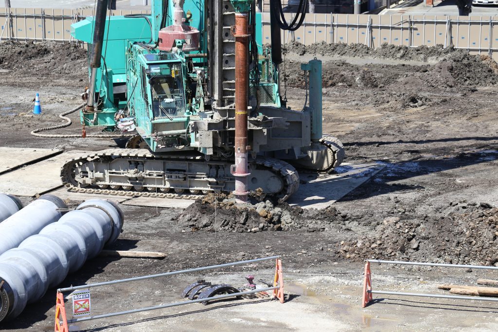 鋼管杭工法鋼管を地中深く打設し強固な支持層まで到達中~長強度は高いがコストも大きい